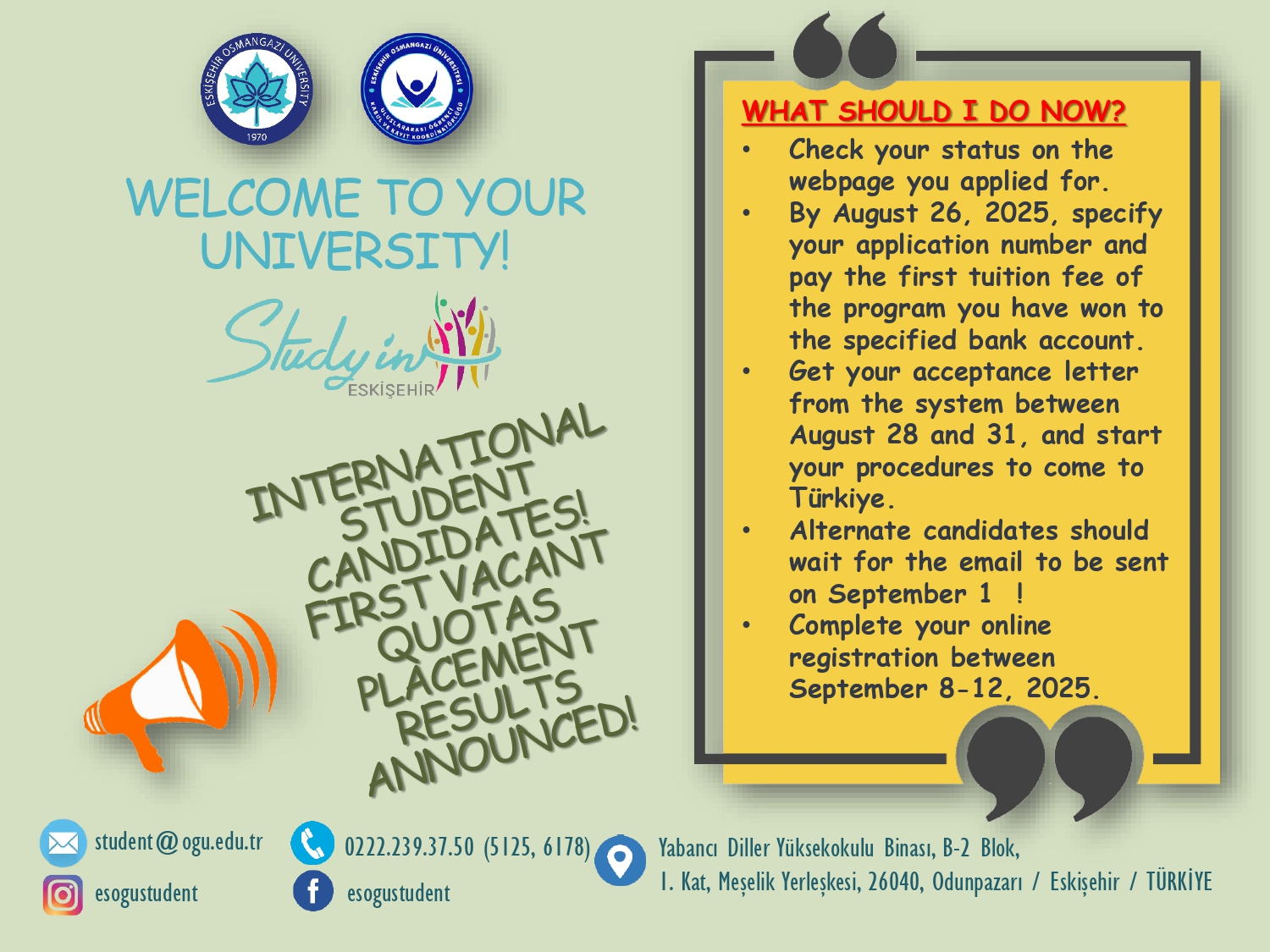 "Those who have been accepted must pay the specified fee for the relevant program to the following bank account by August 26, 2025. When making the payment, the APPLICATION NUMBER and the name and surname of the accepted student must be written in the description section. After making your payment, please send your receipt to student@ogu.edu.tr